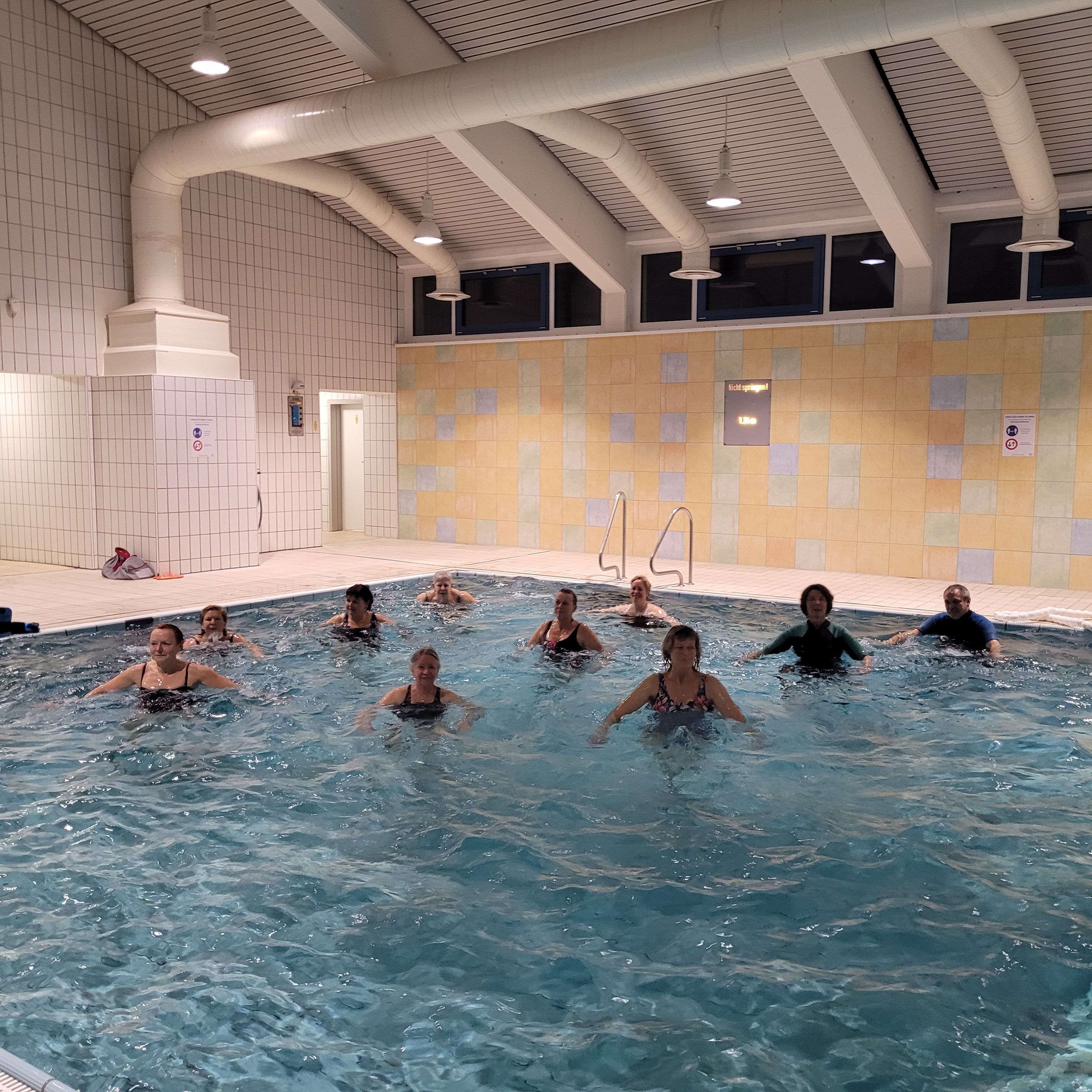 Es erwartet Sie ein dynamisches Kraft- und Ausdauertraining mit einer etwas höheren Belastung. Begleitet durch Musik kommen unterschiedliche Trainingsgeräte zum Einsatz. In diesem Kurs sind besonders Menschen willkommen, die gerne gefordert werden möchten. Um an diesem Kurs teilzunehmen, sollte man sicher schwimmen können.